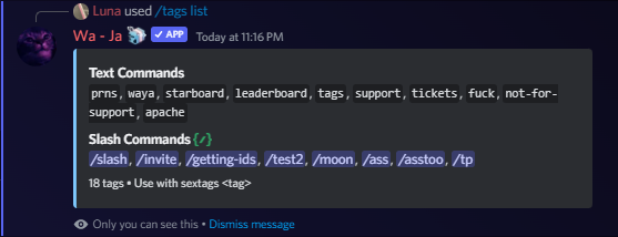 Tags are custom commands that you can set up for your Discord server, designed to help you streamline your communication and avoid repetitive tasks. With Waya, you can **create up to 30 custom commands** on the free plan, and an infinite number of commands with our [Enterprise plan](https://waya.one/enterprise).